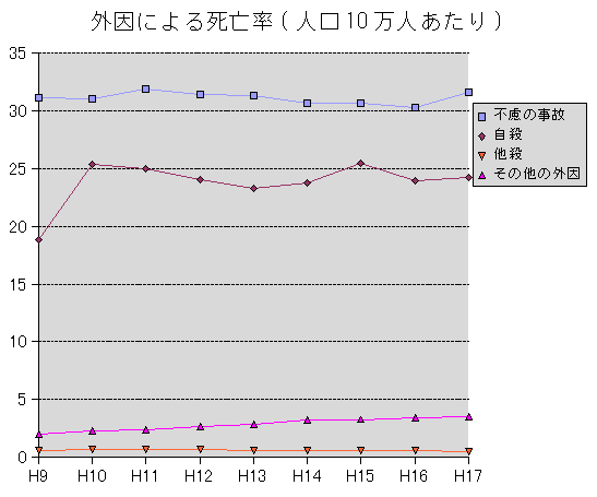 上のグラフで「他殺」が増えていないというのははっきりしているのですが、「その他の外因」がじりじり増えているのは気になります。平成17年は平成9年の80%増です。